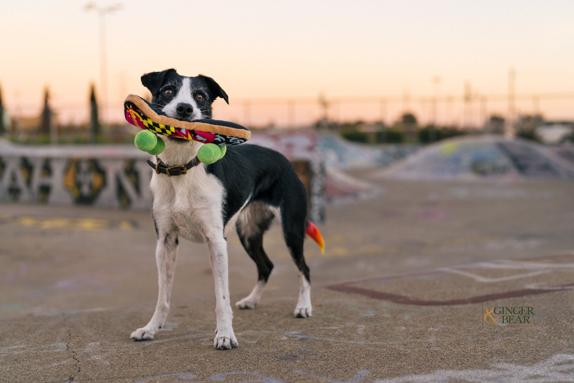You don't have to be a bull-dog to be a skate-boarding star! Show off your moves. When Ollie is too basic. Shuvit! Airwalk! Laser Flip! Or invent new moves, like the SqueakFlip, Crinkl-It with a Box Squeaker and Crinkle in this Kickflippin' K9 skateboard.
