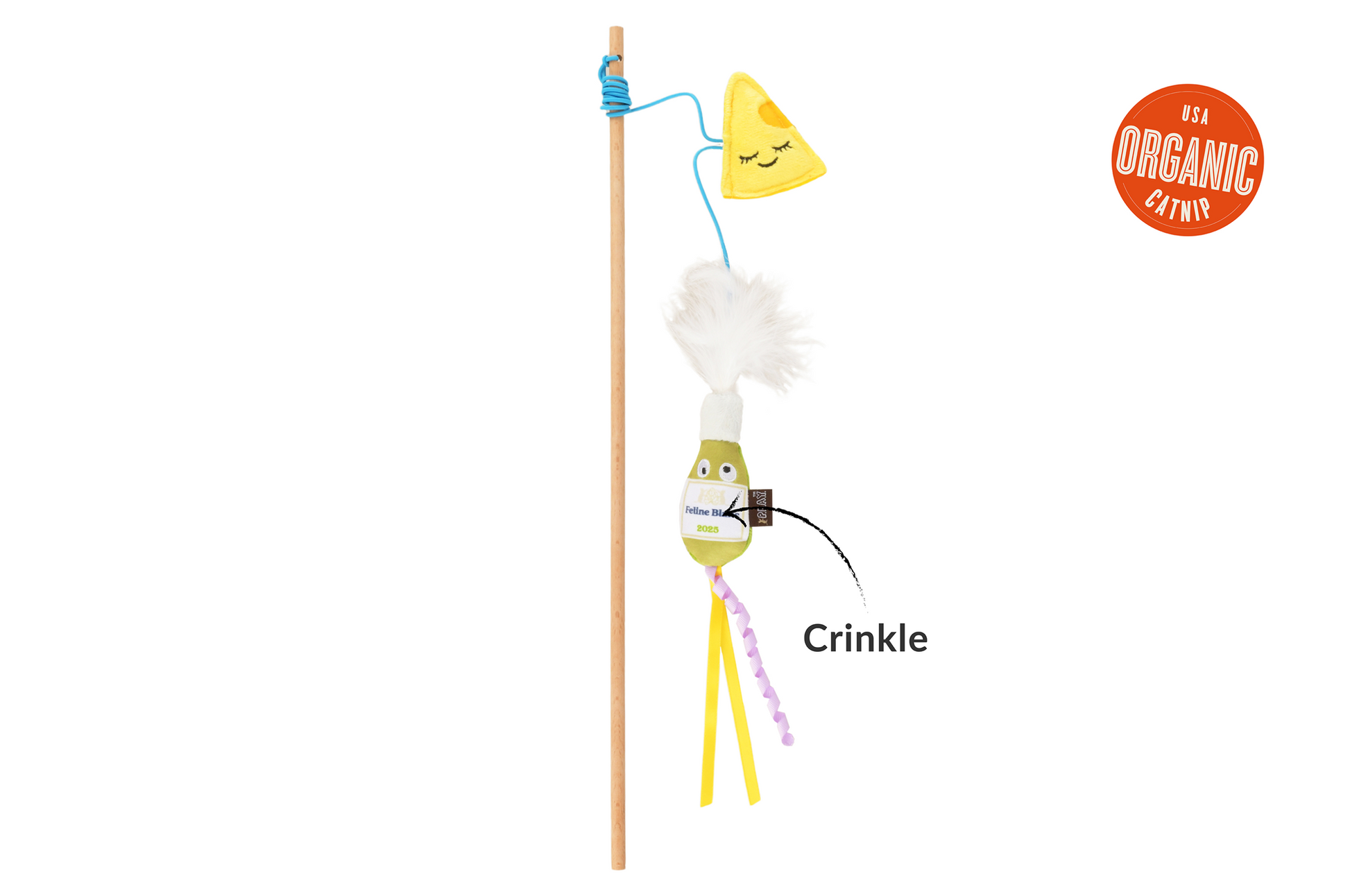 Toast to playtime with P.L.A.Y.’s Feline Frenzy Feline Blanc, the wine-and-cheese-inspired cat teaser wand that will have your cat sampling the finer things like a true sommelier! This plush toy duo features a crinkly wedge of cheese and a bottle of vino, all dangling from a sturdy wand built for chasing and pouncing. Made with irresistibly soft fabrics and pockets filled with a USDA-certified organic catnip, this interactive cat toy offers a five-star experience, no reservation required!