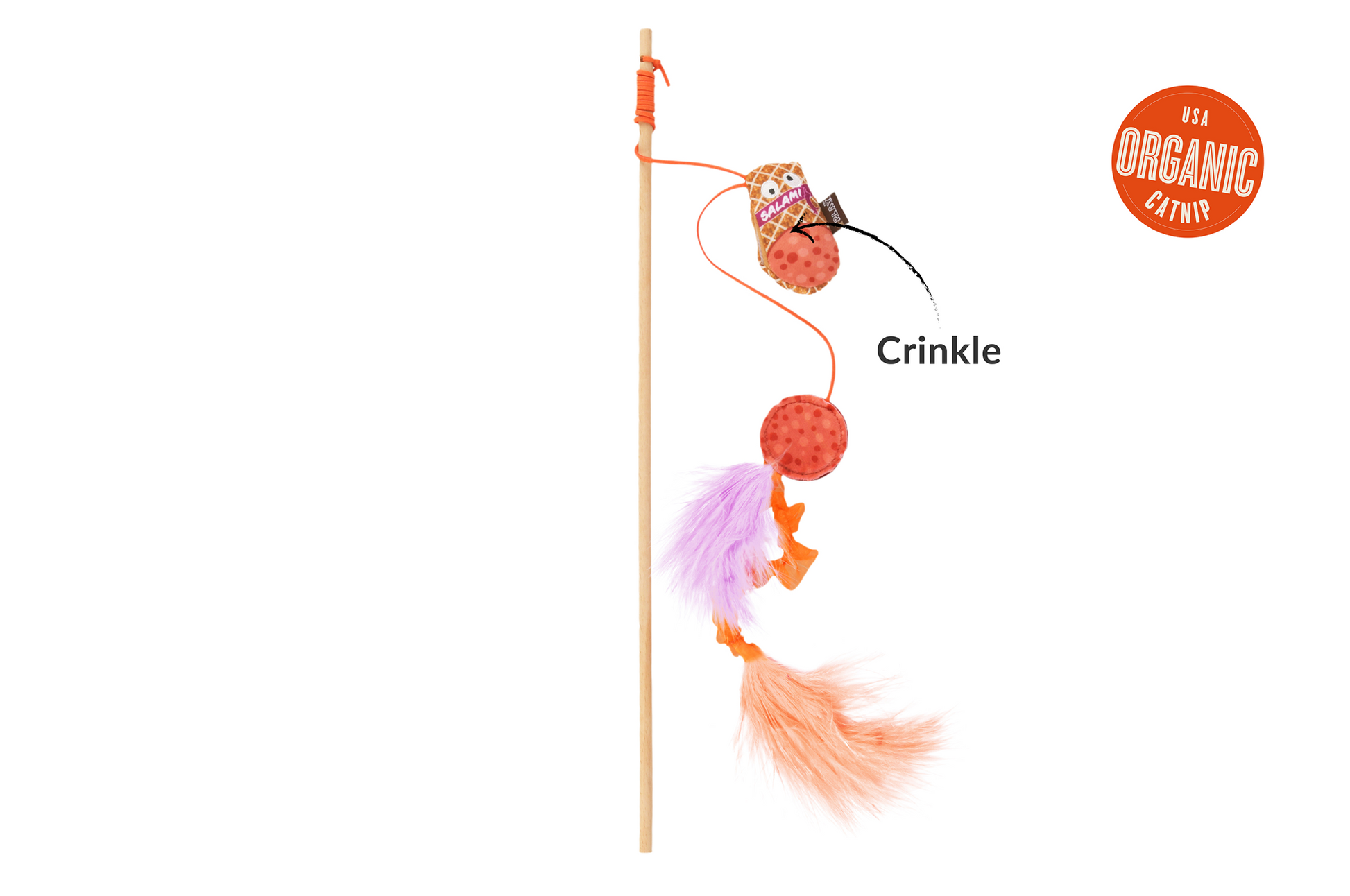 Bring the deli to your living room with P.L.A.Y.’s Feline Frenzy Swatlami, the salami-themed cat teaser wand toy your feline will be drooling over! Crinkly salami slices dangle from a durable FSC-certified wooden wand, enticing your kitty to leap, pounce and play. Stuffed with USDA-certified organic catnip and stitched with premium fabrics, it delivers irresistible flavor and fun!